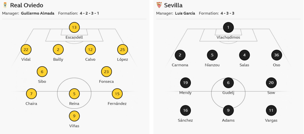 Sevilla’s attacking trio includes Ruben Vargas, A. Adams, and Juanlu Sánchez, aiming to break down Oviedo’s defensive setup.